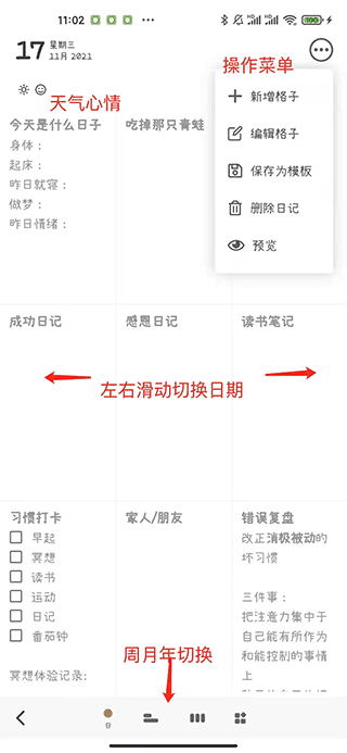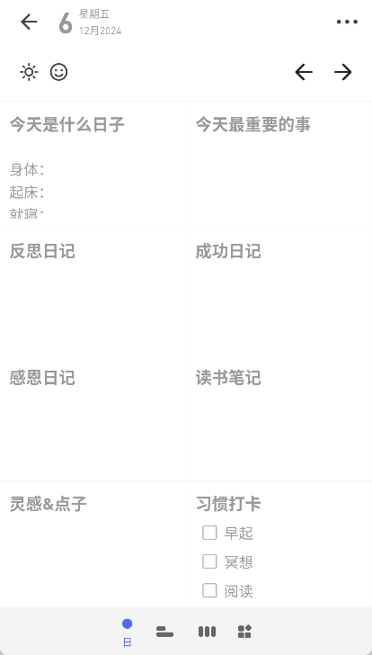 我们提供强大又灵活的格子形式,能帮你专注于回顾思考与记录,重新掌握日记的主动权。让你下笔更轻松,每日总结回顾和反思更高效,通过填写格子收获充实的满足感。