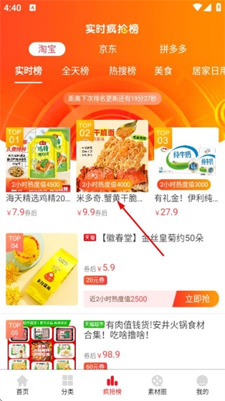 2、在实时疯抢榜页面找到目标商品并点击,即可进入该商品的详情页面。