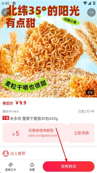 3、在商品详情页核对好相关信息后,点击页面底部的领券购买按钮,即可开展该商品的购买流程。