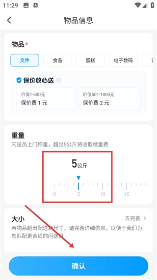 4、设置物品的重量(例如【5公斤】),确认相关信息无误后点击【确认】按钮,以推进配送订单的流程。