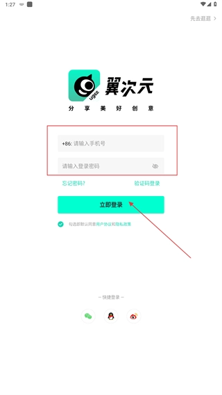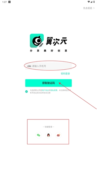 在翼次元的登录页面,用户可以选择两种登录方式:一种是短信验证登录,具体操作是输入手机号后点击【获取验证码】;另一种是通过微信、QQ等快捷方式直接登录。