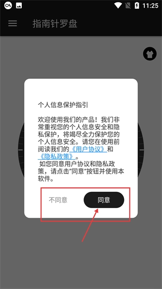 在使用【指南针罗盘】前,请先阅读【用户协议】和【隐私政策】,然后点击弹窗里的【同意】按钮,这样就能进入软件的主界面了。