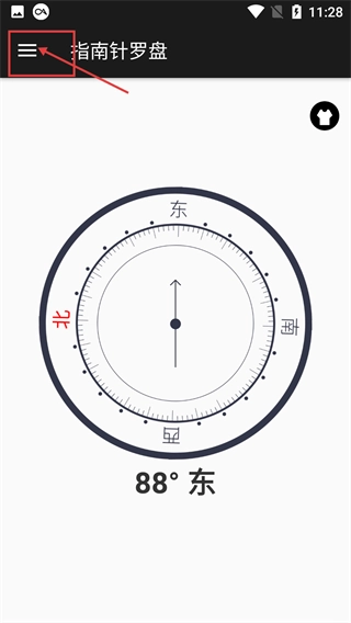 2、进入【指南针罗盘】主界面后,点击左上角的菜单按钮,即可展开功能菜单,与此同时还能查看当前方位信息(例如88°东)。