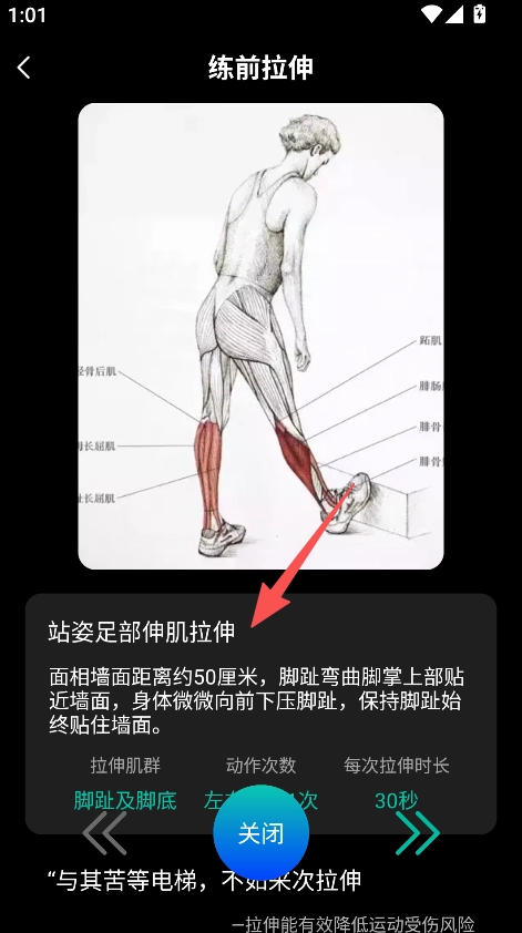 2、点击练前拉伸,学习站姿足部伸肌拉伸等动作,为运动做好准备。