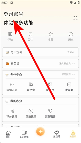 1、打开陕西起点新闻客户端,点击底部导航栏的“未登录”按钮,进入个人页面。