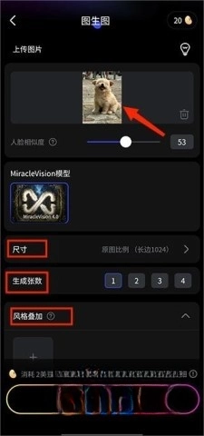 2、点击上传图片,选择人脸相似度、风格叠加、画面风格提示词等相关选项;