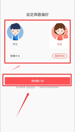 1、先选择性别再点击下面的开始听小说按钮。