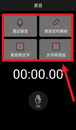 1、在主界面中可见四大功能按钮,分别是通话录音、实时解析、录音转文字与文字转语音,便于一键操作选择。