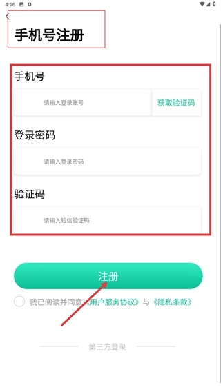 3、若没有账号,点击【注册】按钮进入手机号注册页面。在此页面中,依次输入手机号、设置登录密码、获取并填写验证码,勾选相关协议后,再次点击【注册】即可完成账号创建。