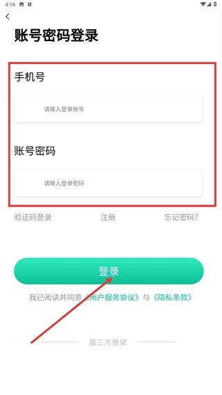 2、进入【账号密码登录】页面,输入已注册的手机号和账号密码,勾选相关协议后点击【登录】按钮,完成账号验证流程。