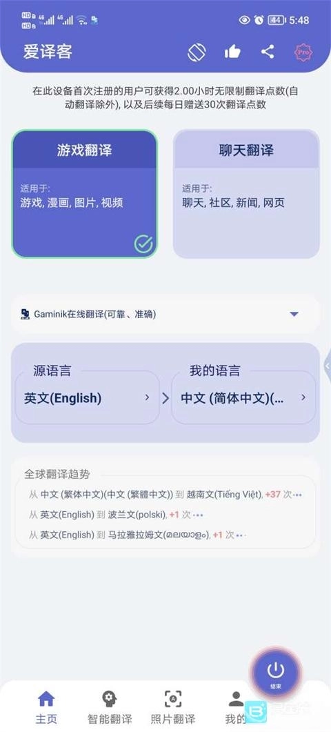 3、接着依据自身的实际需求,挑选游戏翻译功能或者聊天翻译功能。