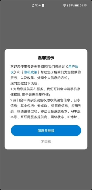 1、软件安装完成后打开进入,会弹出温馨提示窗口,点击“同意并继续”按钮即可。