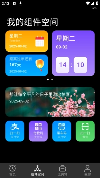 3、在组件多多里,你可以查看日期等相关信息,同时还能找到扫一扫、付款码以及乘车码等功能入口。