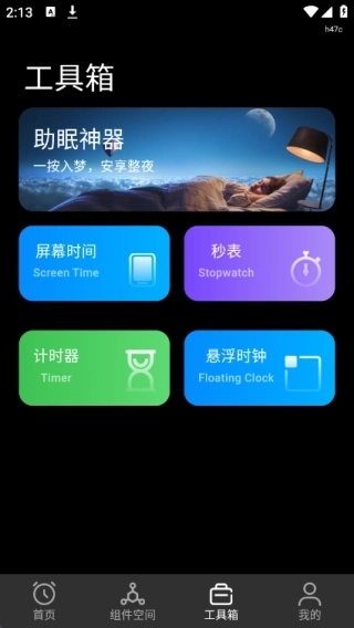 4、工具箱内配备了助眠神器,同时包含屏幕时间、秒表、计时器以及悬浮时钟等多个不同的功能版块。