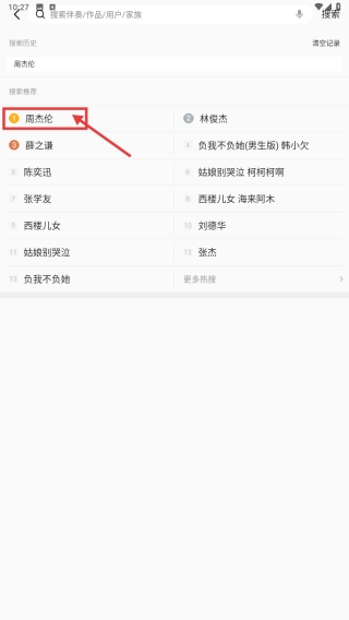 在搜索页面,点击周杰伦选项,进入周杰伦相关内容列表。