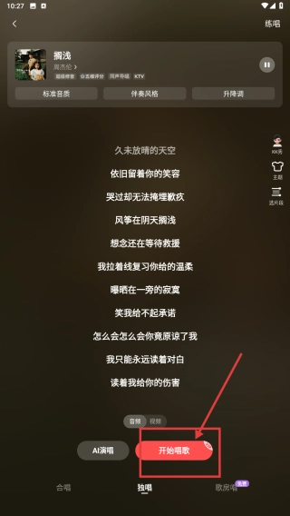 在播放页面,点击开始唱歌按钮,开始演唱搁浅。