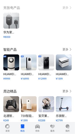 2、精选版块设有“购物频道”,用户可在此选购华为旗下各类产品;此外还有“周边精品”,其中包含四款智选产品。