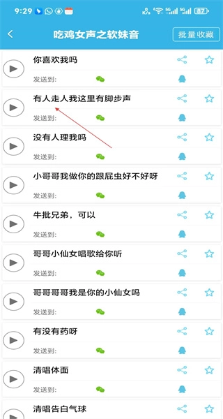3、切换到吃鸡女声里的软妹音分类,能看到多条适配吃鸡场景的语音,点击其中任意一条语音,就可以准备在游戏中使用了。