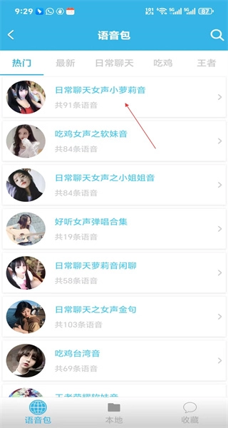 1、启动软件后,进入语音包的热门分类界面,选择日常聊天女声里的小萝莉音,即可进入该风格对应的语音列表页面。